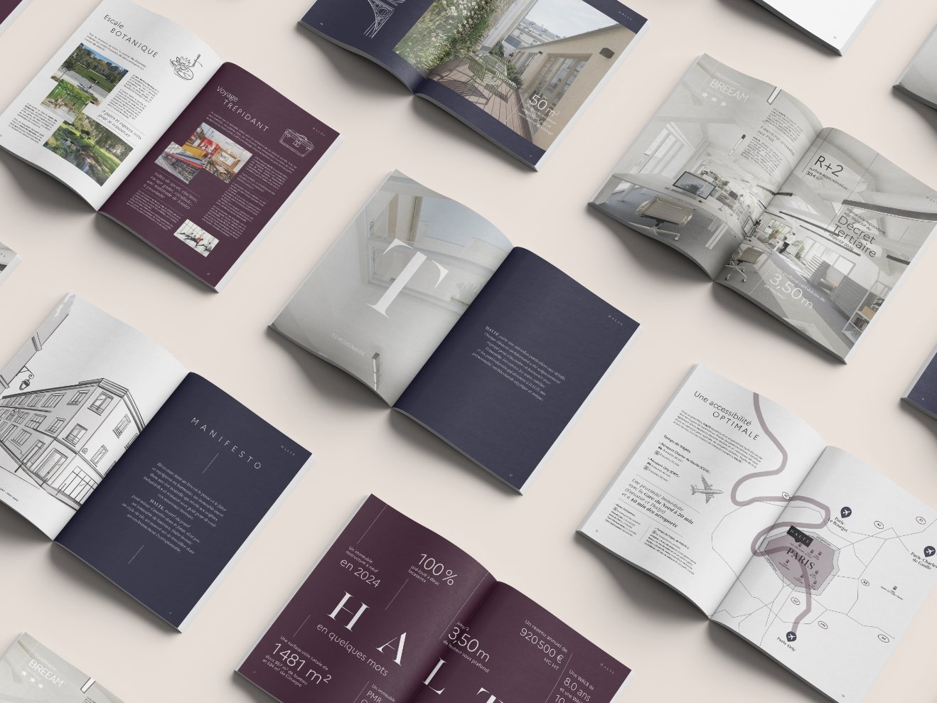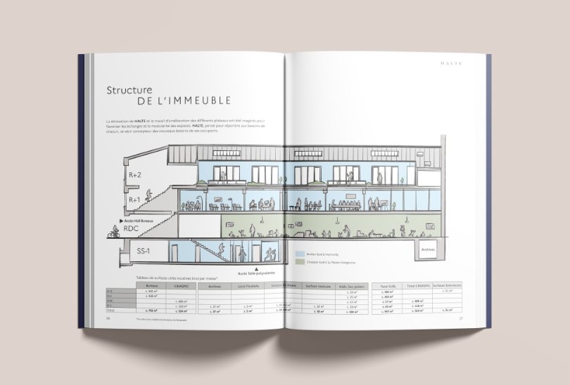 Inspirés par les explorations audacieuses de Victor Jacquemont, nous avons imaginé la brochure de commercialisation comme un carnet de voyage, point de départ d’une aventure professionnelle réussie. L’ensemble des prestations de cet immeuble au style atypique et unique se concentre sur le bien-être des collaborateurs, offrant ainsi une escale intemporelle dans le rythme effréné du quotidien parisien.